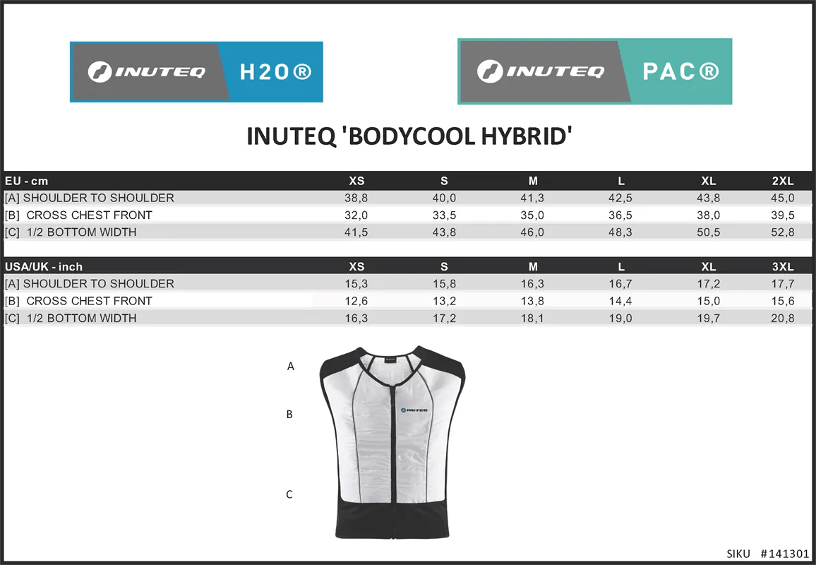Hybridné chladiace riešenie 2 v 1 pre maximálnu úľavu: Odparovacia chladiaca tkanina INUTEQ-H2O® na 2 až 8 hodín chladenia po každom namáčaní a vložky z materiálu na zmenu fázy INUTEQ-PAC® na biologickej báze udržujú pohodlnú konštantnú teplotu až 2,5 hodiny (závisí od použitia vložiek 6,5°C alebo 15°C).